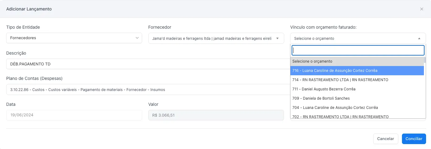 Agora, na conciliação bancária, você pode vincular um lançamento a um orçamento/projeto.